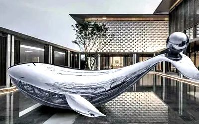 酒店不銹鋼雕塑以美為主,一般為裝飾性美陳景觀雕塑,常見于酒店大門、大堂、園林。包括但不限于水景景觀類,如圓環、噴泉、鏤空球;裝飾美陳類,如蓮花、翅膀、鵝卵石、水滴等。